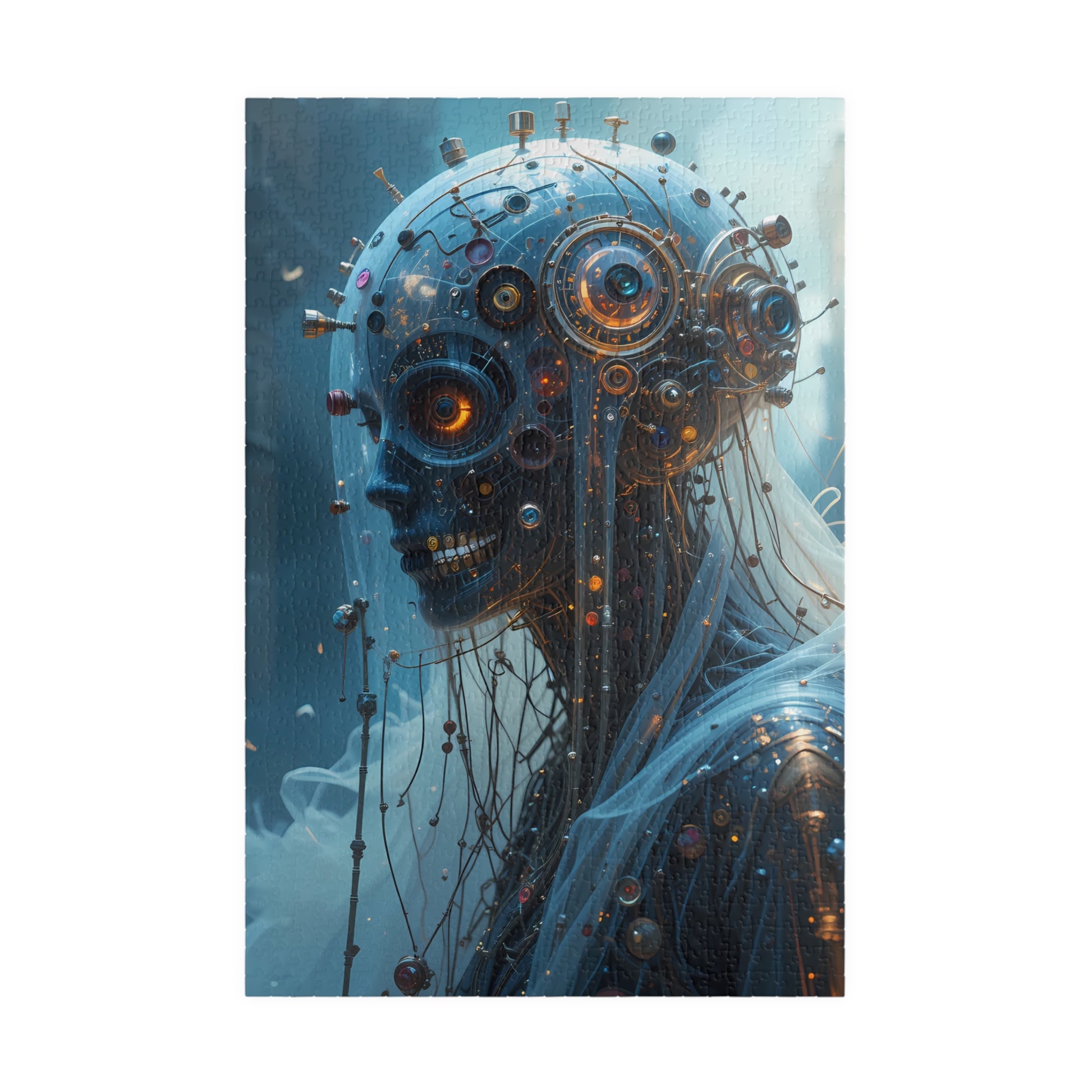 This puzzle features The Clockwork Widow — Her face is a lattice of gears and wire, forever grieving the world that built her — yet unable to let it go.
