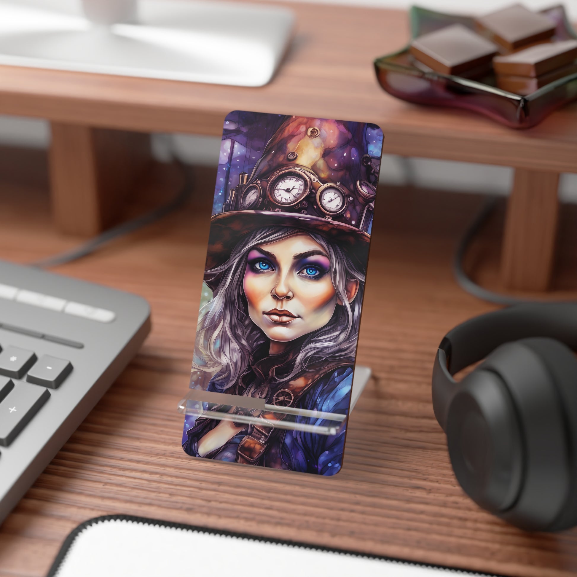 Keep your phone propped up in steampunk style with Sylvaen, the Twilight Alchemist. Her design shimmers with copper tones and twilight hues, perfect for desks, nightstands, or gifting.